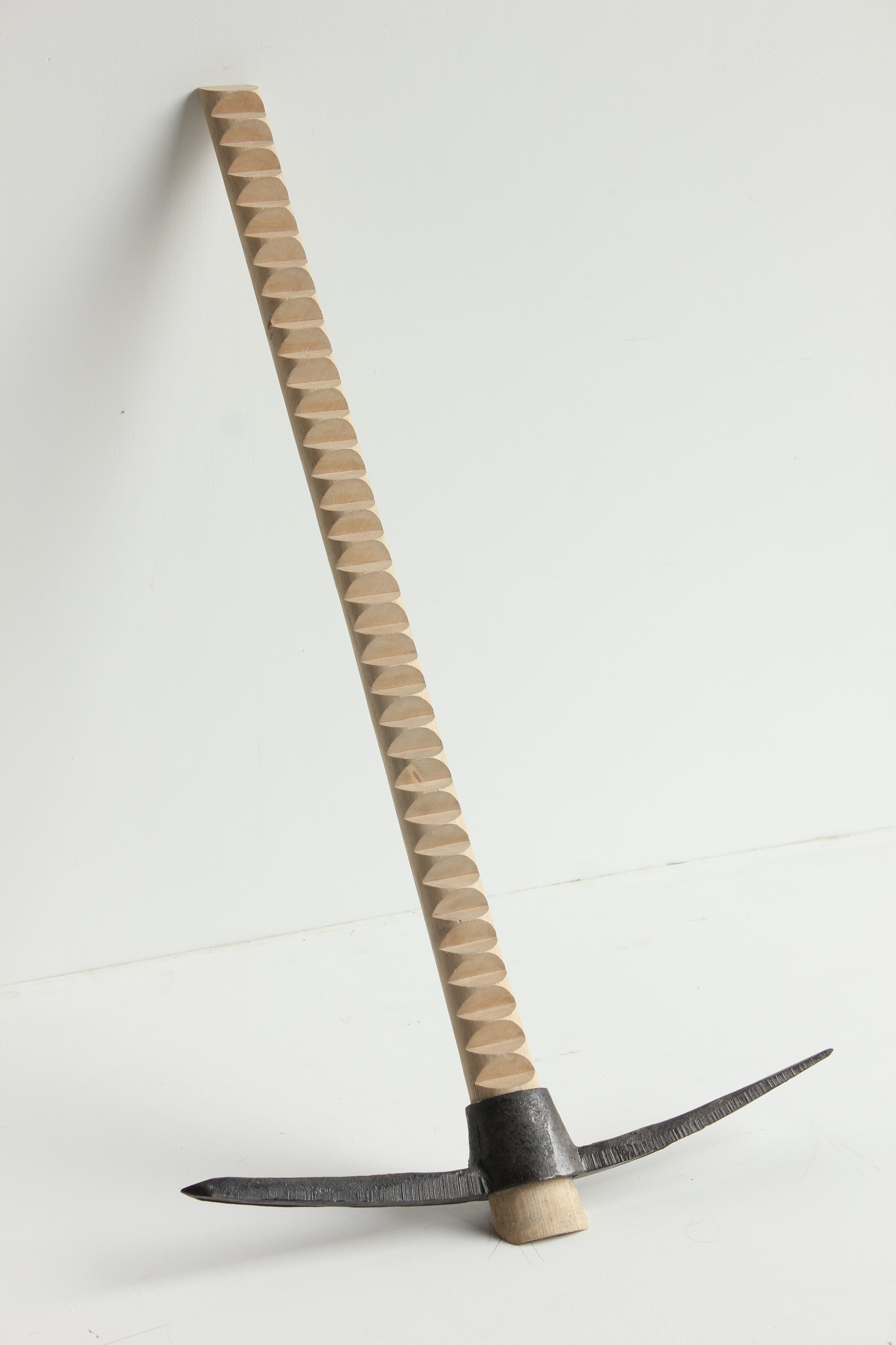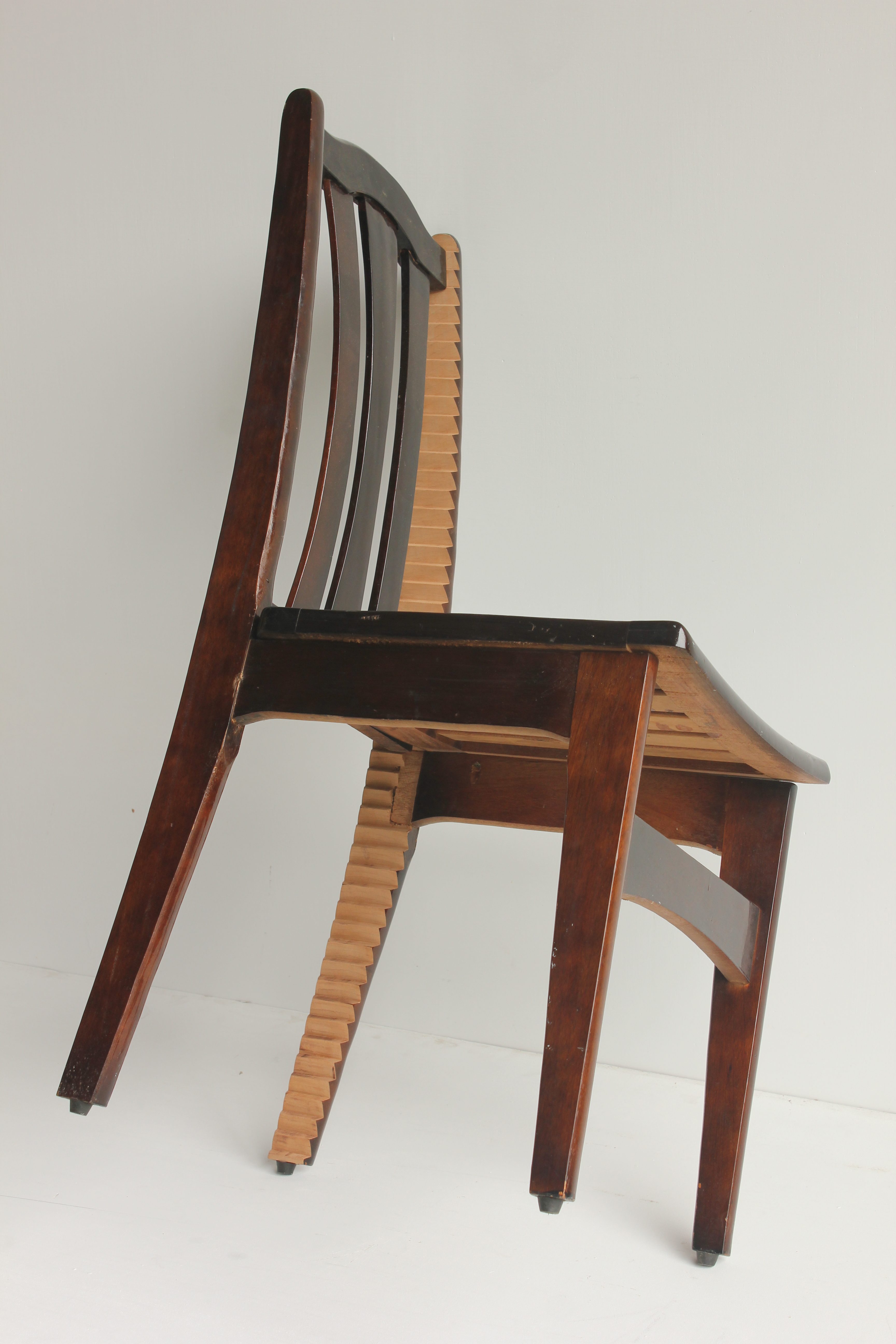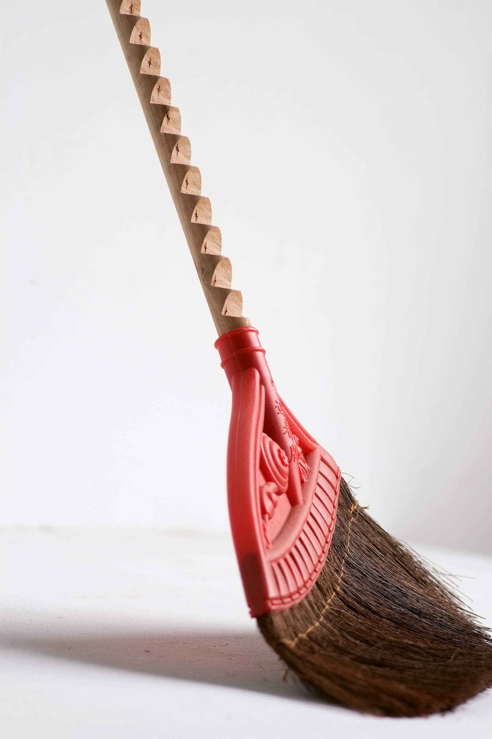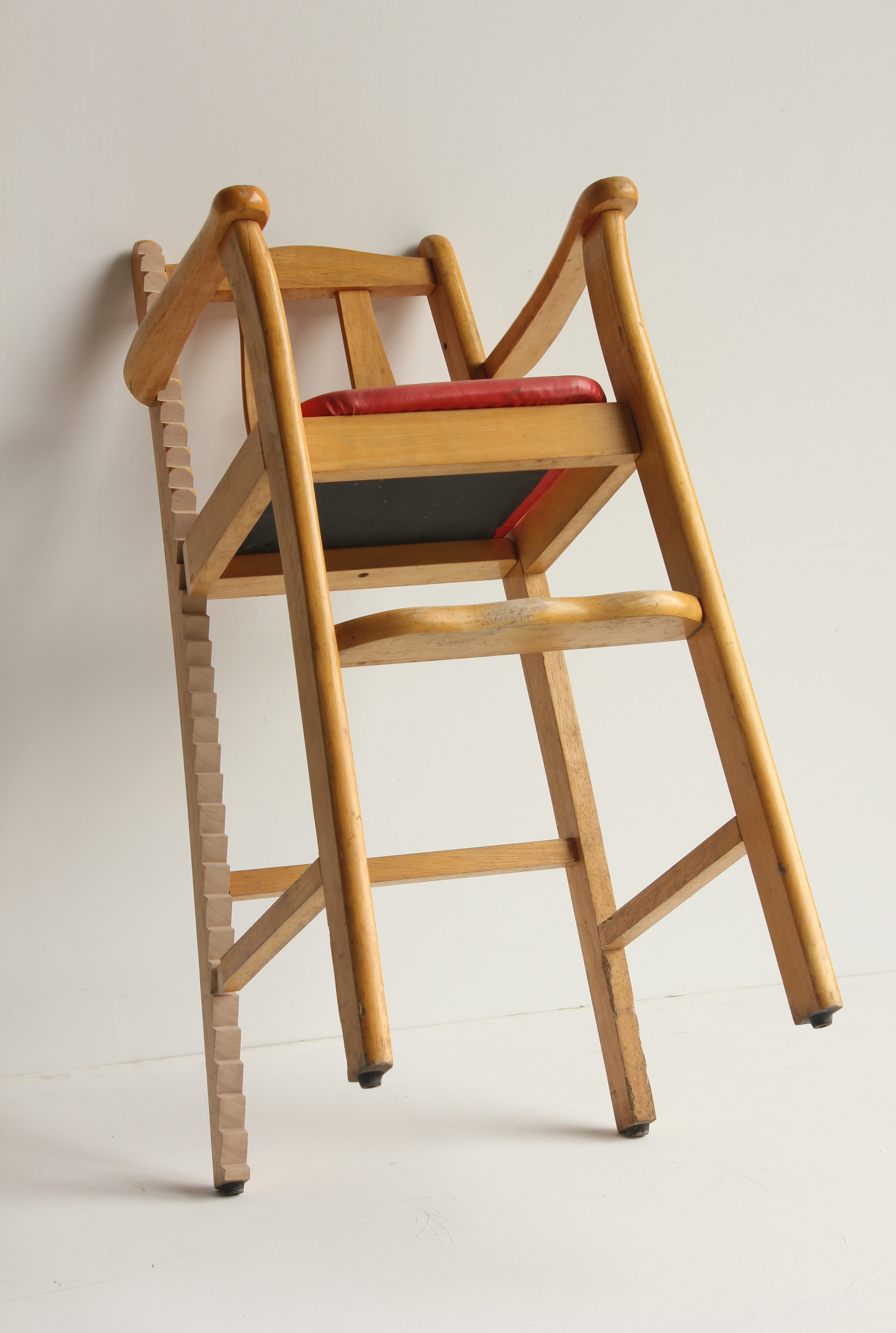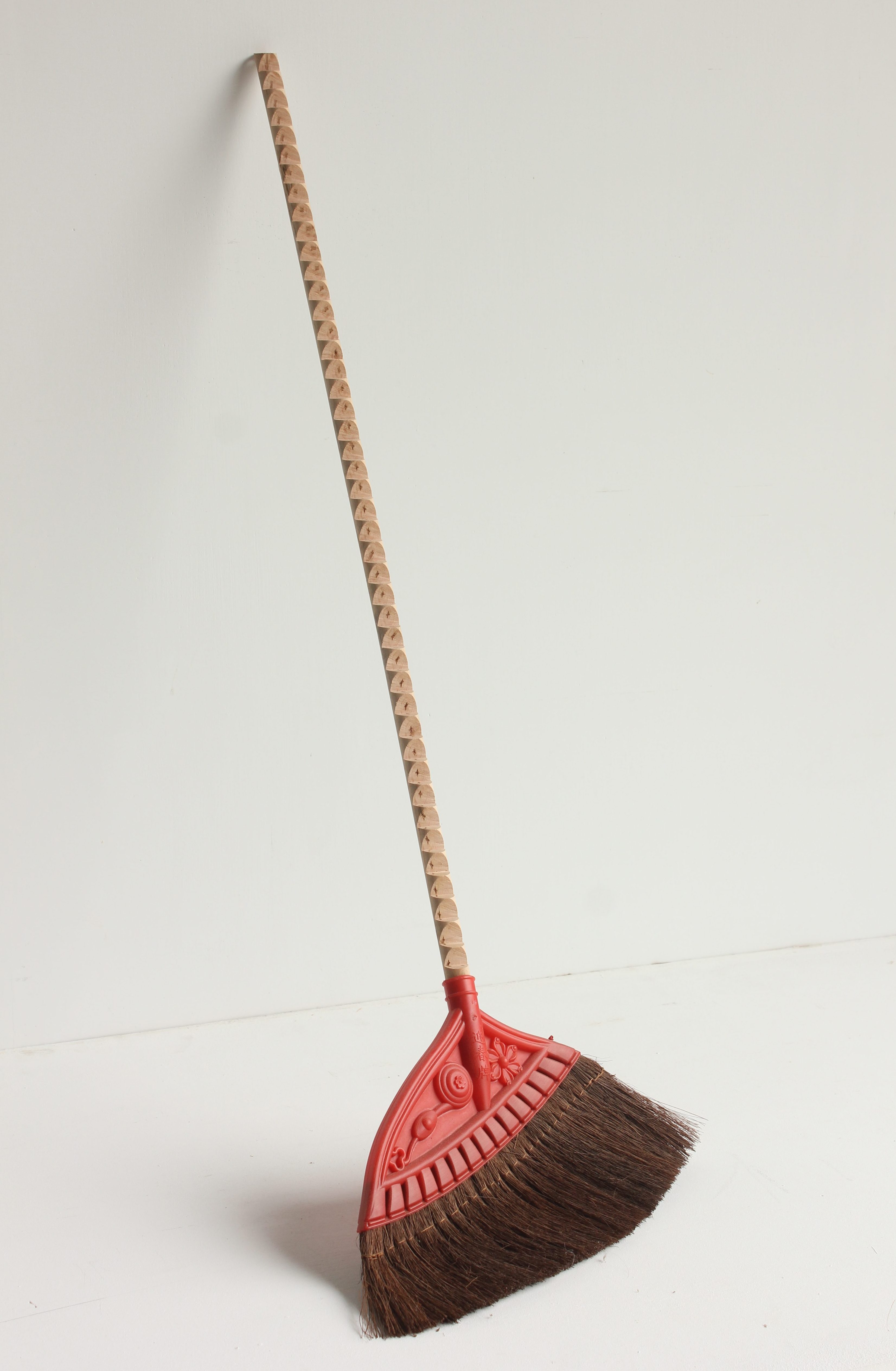 看著不經意倚靠在牆壁上的掃把,產生了微小空間的想像,進而發展出這一系列的作品。在生活中常見的木製現成物上鋸切、鑿刻出微型的階梯,然後以手工修整將每件傾斜度不同的小階梯的每階都做得與地面平行,僅可能的模擬人工所製造的階梯形式,讓尺度不同的二個世界-物件、空間(階梯)同時存在,使得現成物在習慣的定義下,產生輕盈的、新的可能性。並藉此探討藝術品以現成物為材料,在台灣,今時今日的價值為何?現成物所造的階梯能突破人性通往另一個價值體系嗎?此外,階梯對我的概念而言,除代表了空間尺度的元素外,感性地來說,我們或許都生而在階梯的某一階,有高有低,不論是誰,或許終其一生都在尋找一個平面;但選擇往上走或是往下走?選擇哪一個平面?便是一念之間的差異罷了。