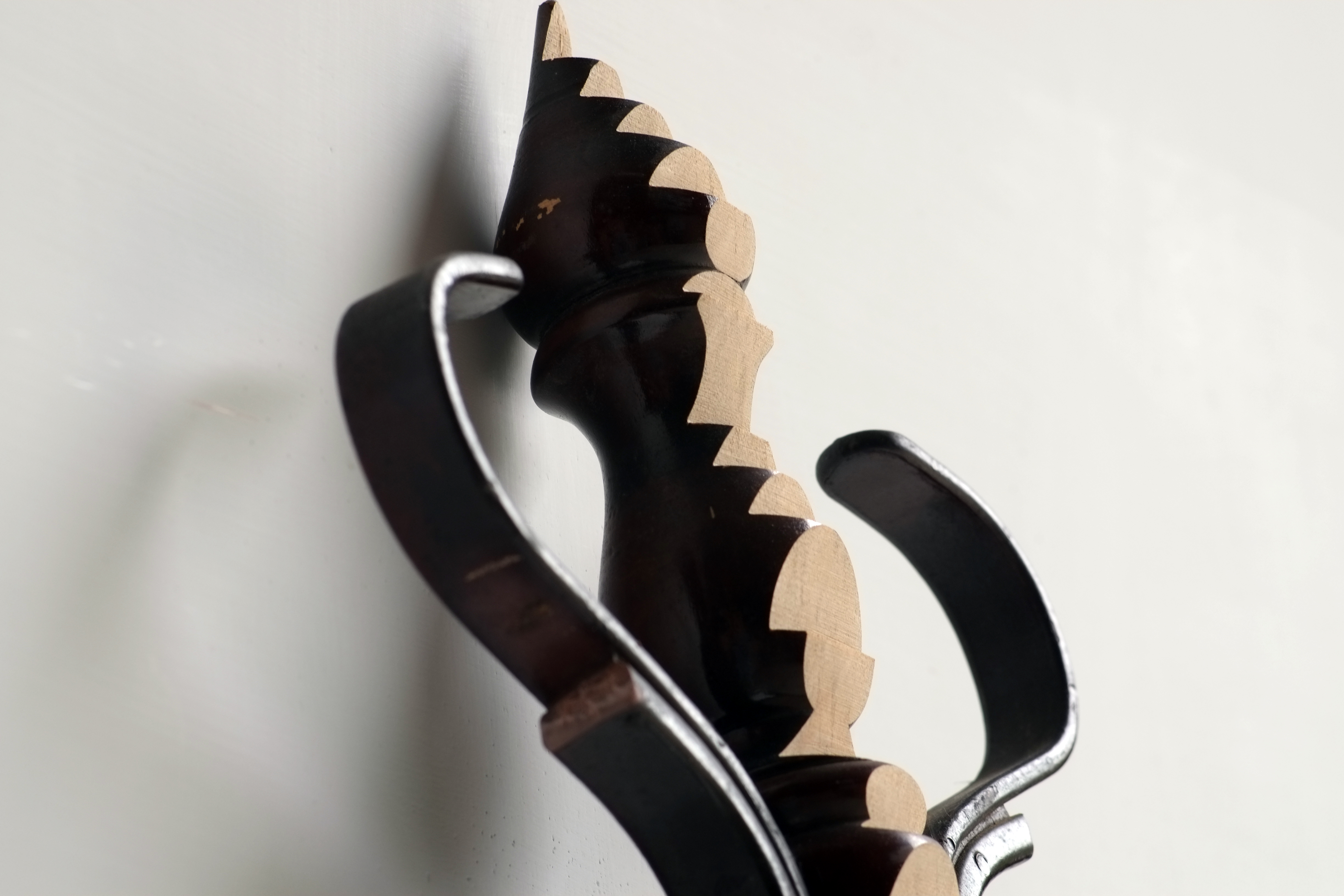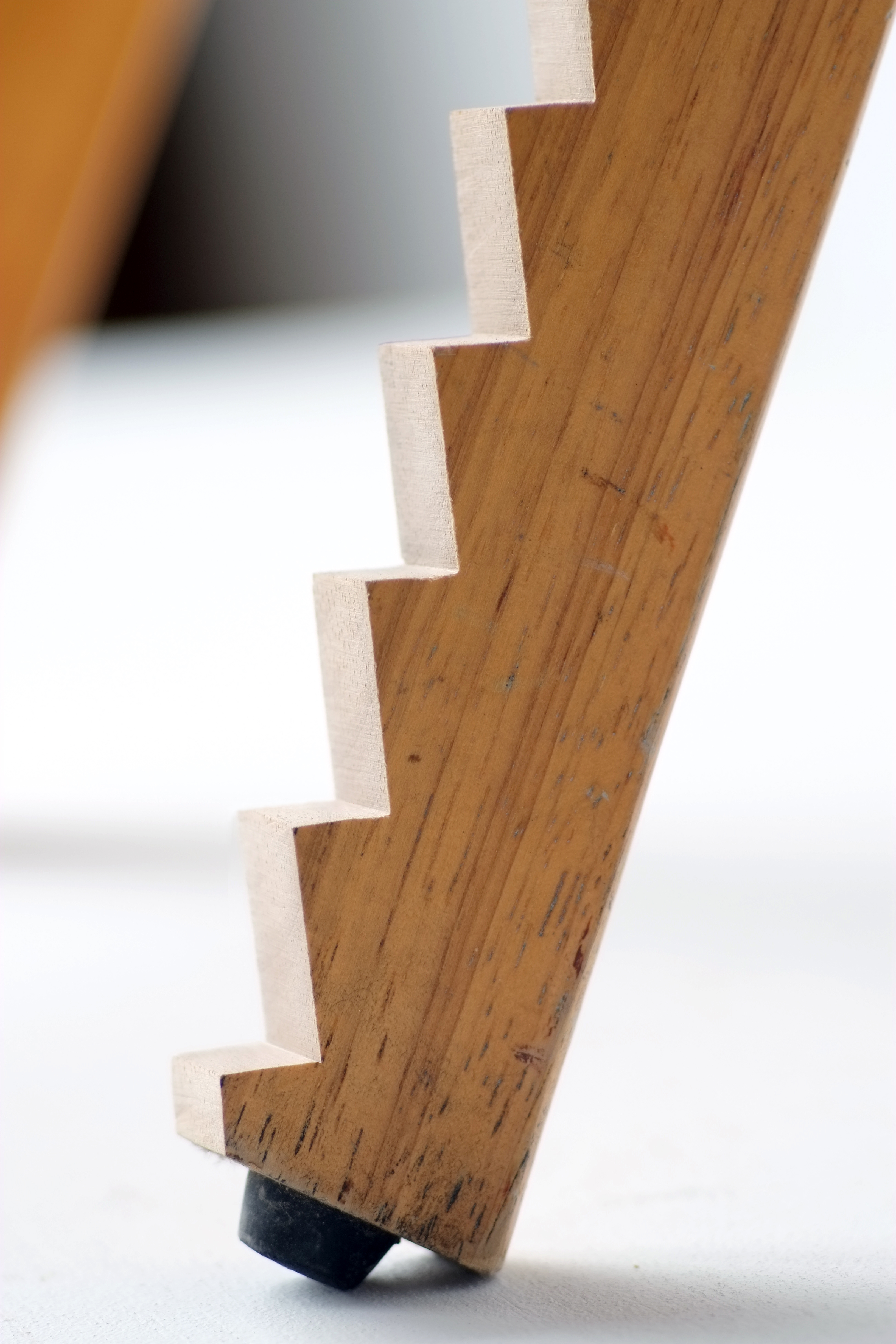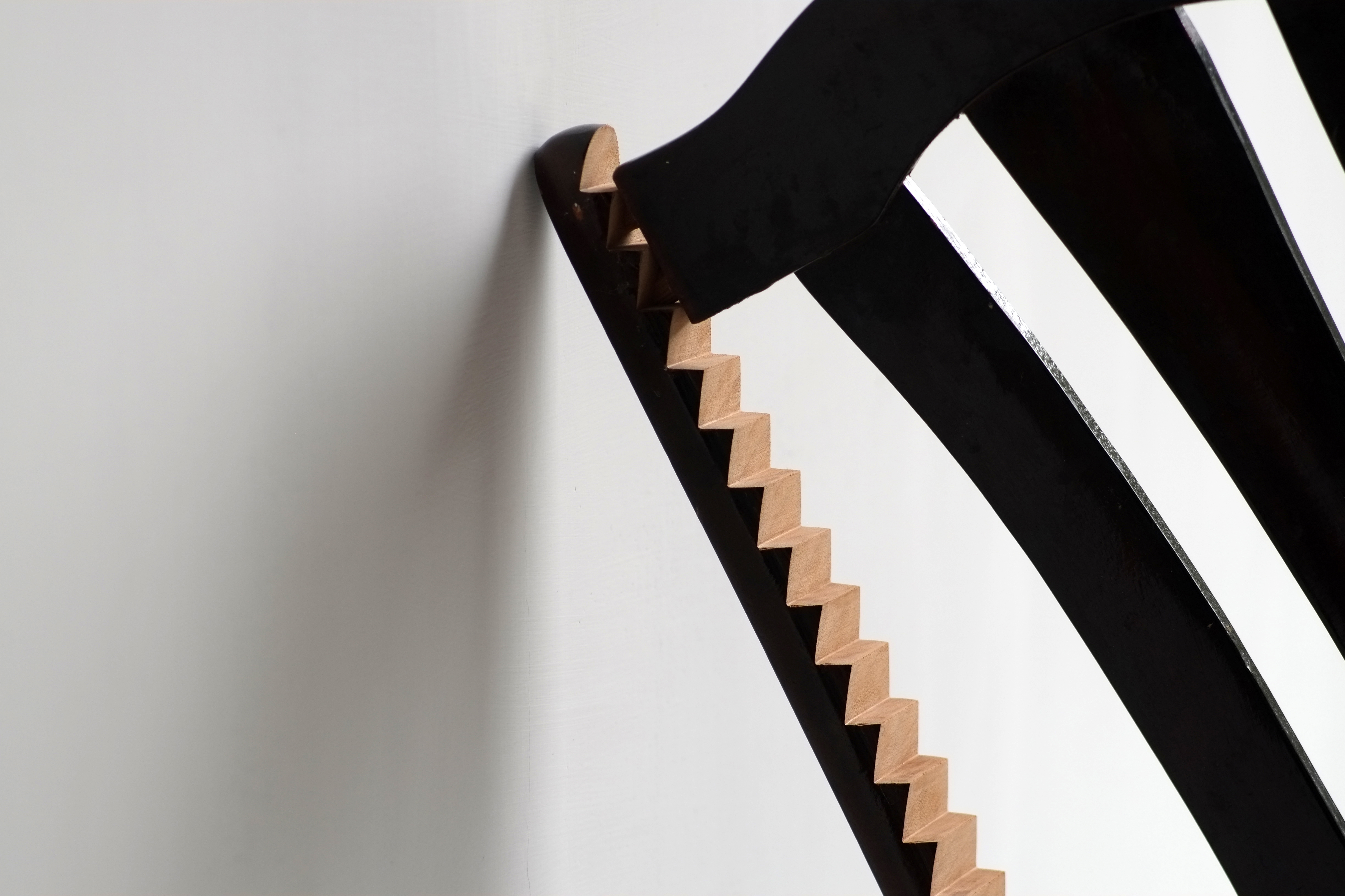 我想試著在現成物作為藝術的基礎上,加入自己鑿刻的痕跡。以階梯比喻空間,讓物件與空間看似衝突的二者並存。