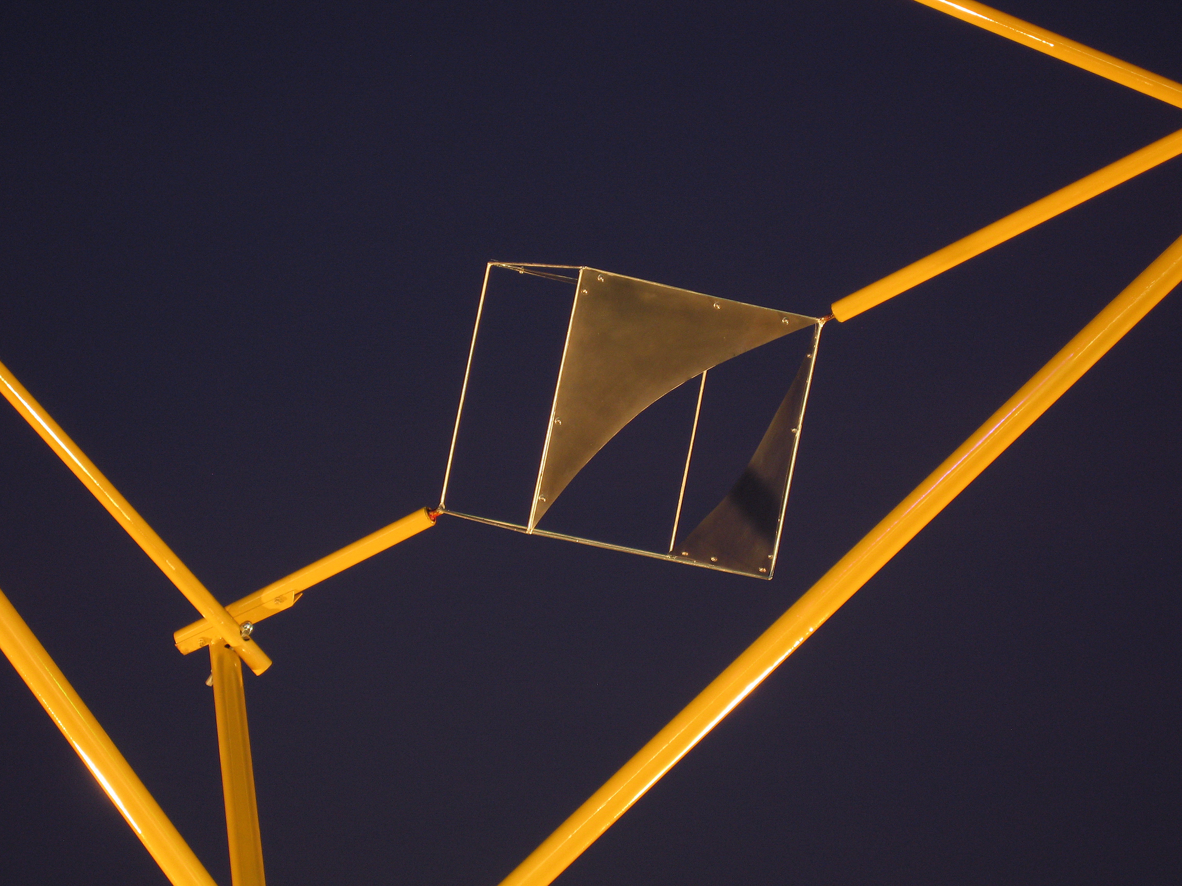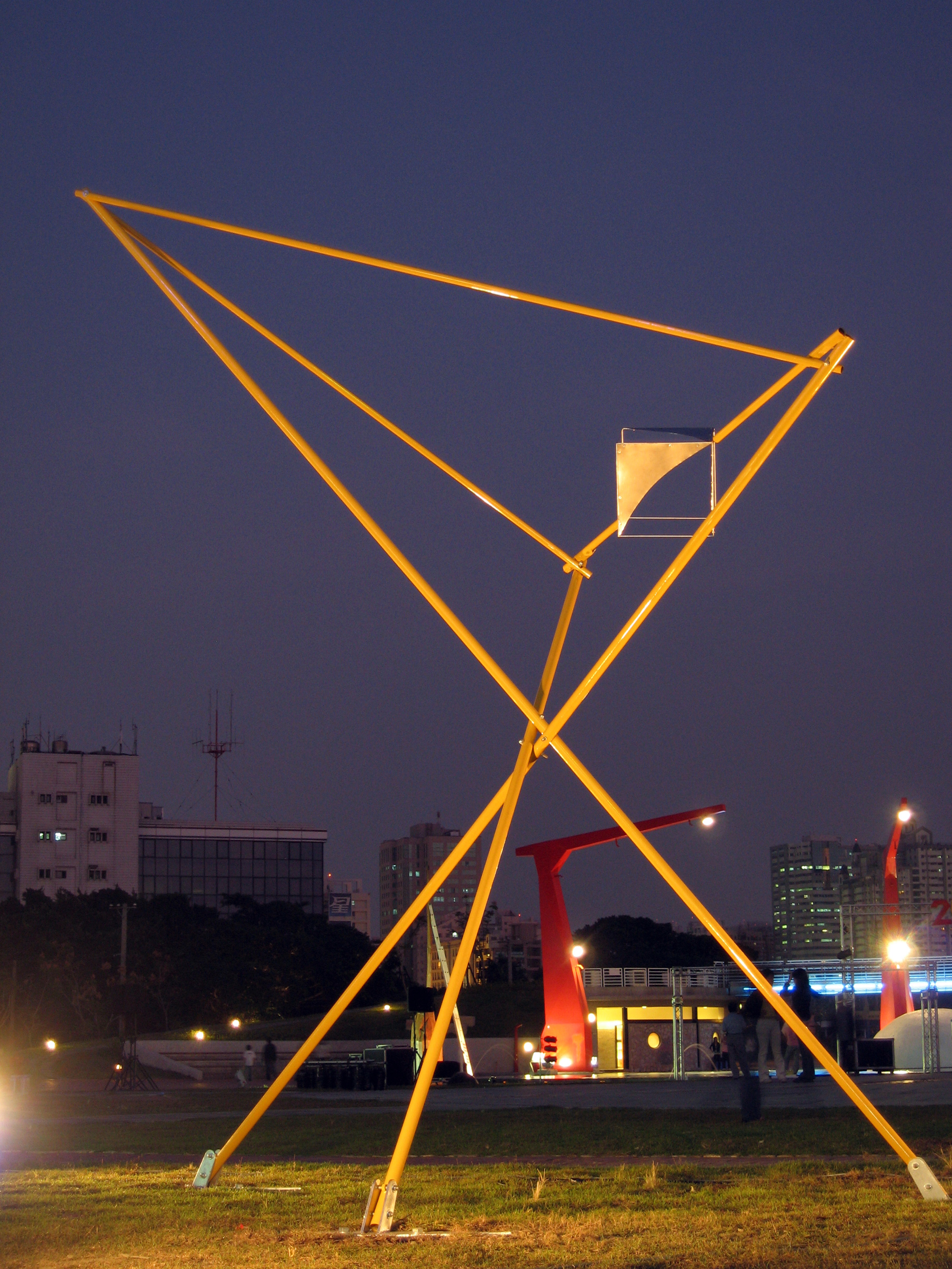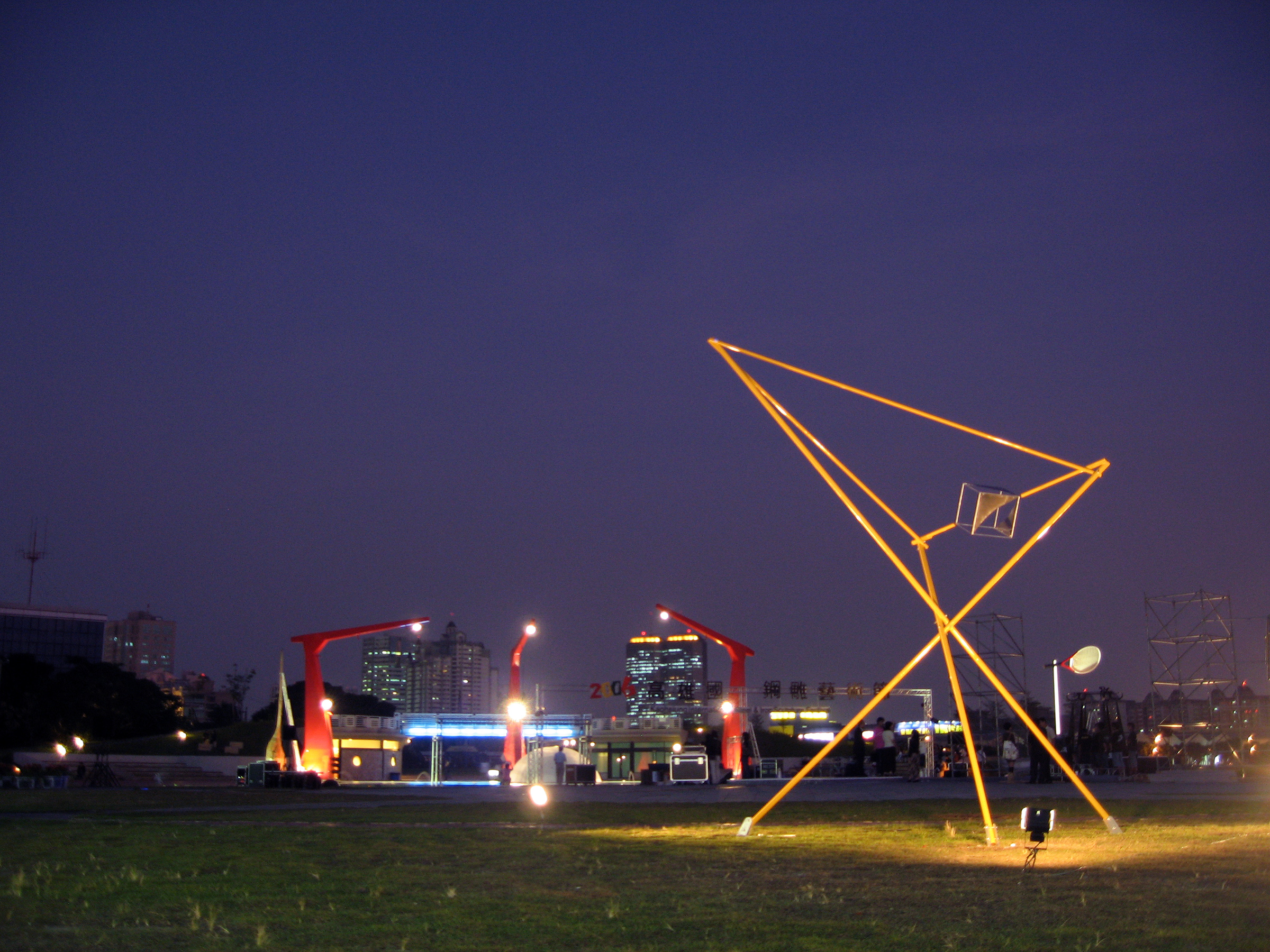 夢想引擎 Dream Engine作品概要:受邀於高雄鋼雕藝術節的作品,那年主題是風動,我們在主結構上創作了螻空的立方體結構,局部加上葉片成了會旋轉的方塊,靠著風力在空中不斷旋轉,像是一具靠夢想帶動的引擎般地將要起飛。關鍵字:風、立方體、引擎、夢想、動力機械鋼鐵、不鏽鋼Steel,stanless steel3 x 3 x 6 M2006 (Collaborated with Kaori Takeshita)