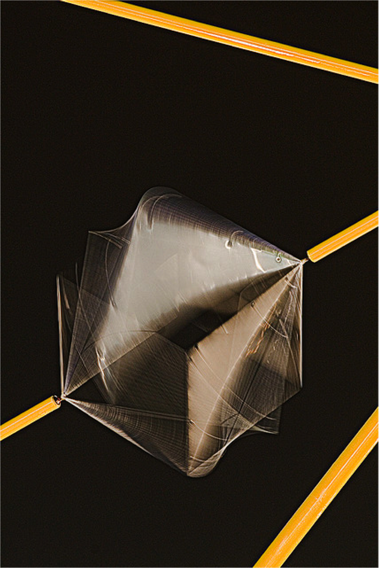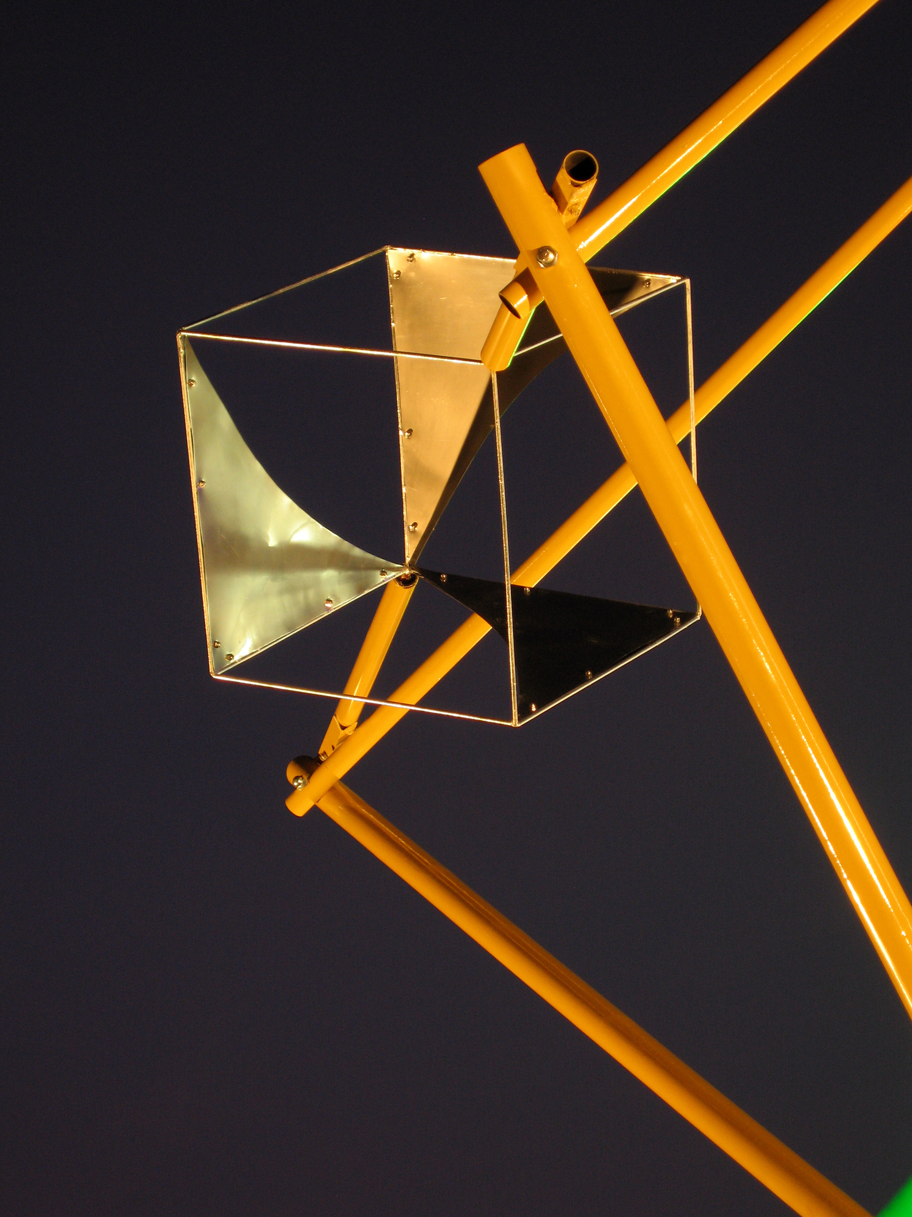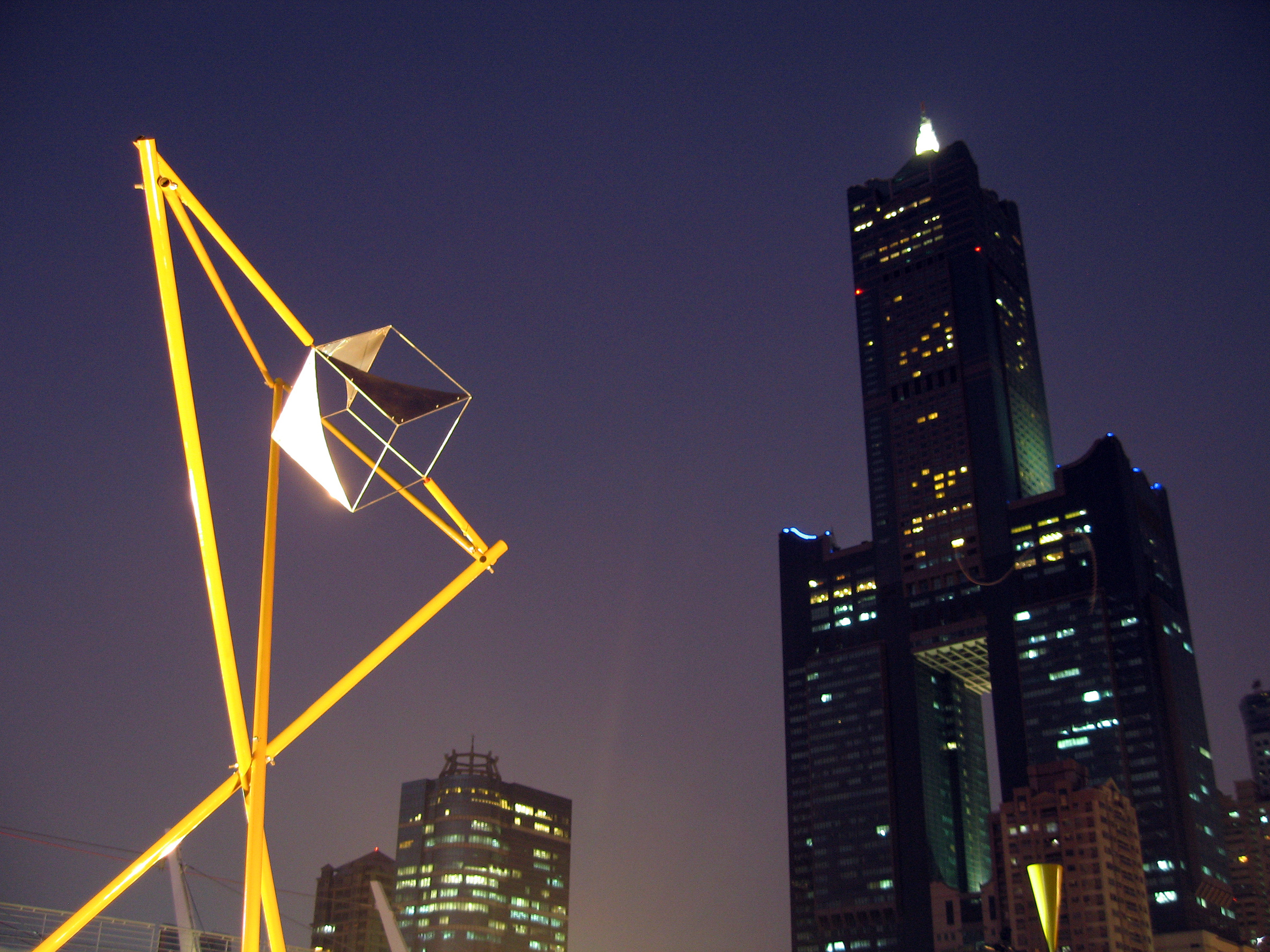 夢想引擎 Dream Engine作品概要:受邀於高雄鋼雕藝術節的作品,那年主題是風動,我們在主結構上創作了螻空的立方體結構,局部加上葉片成了會旋轉的方塊,靠著風力在空中不斷旋轉,像是一具靠夢想帶動的引擎般地將要起飛。關鍵字:風、立方體、引擎、夢想、動力機械鋼鐵、不鏽鋼Steel,stanless steel3 x 3 x 6 M2006 (Collaborated with Kaori Takeshita)